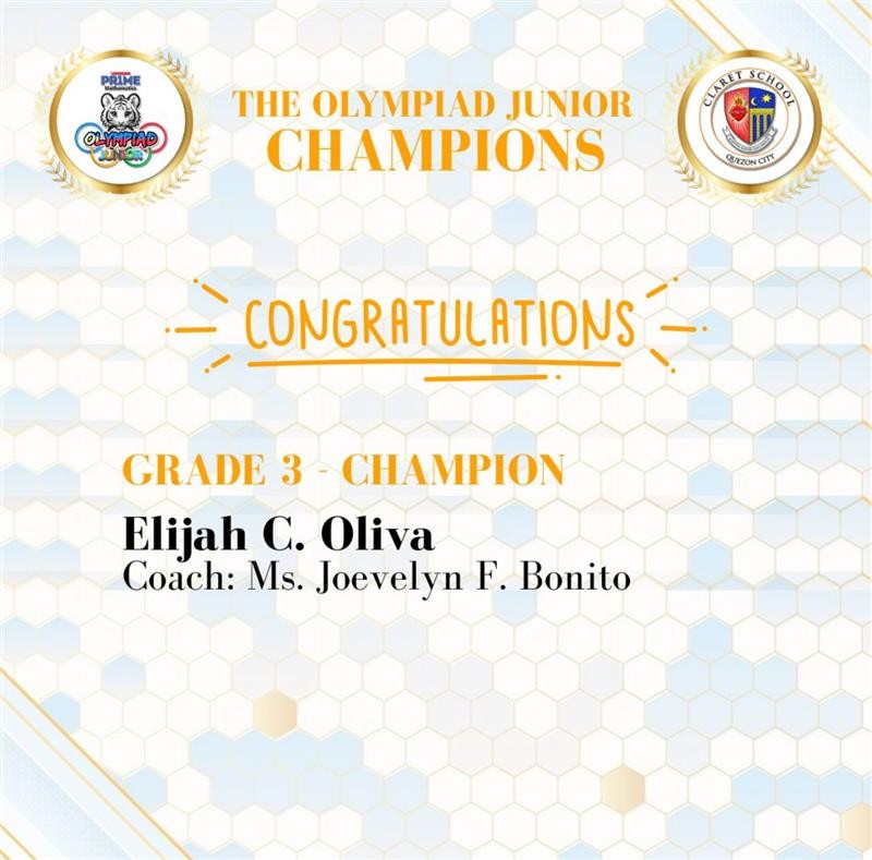 Among participants from 72 competing schools nationwide, Grade 3 Claretian Elijah C. Oliva triumphed and secured a spot among the Top 10 Champions of the competition, reflecting not just his mathematical prowess but also his grit and commitment to excellence. The virtual awarding ceremony was held last March 14, 2026, during the International Day of Mathematics.