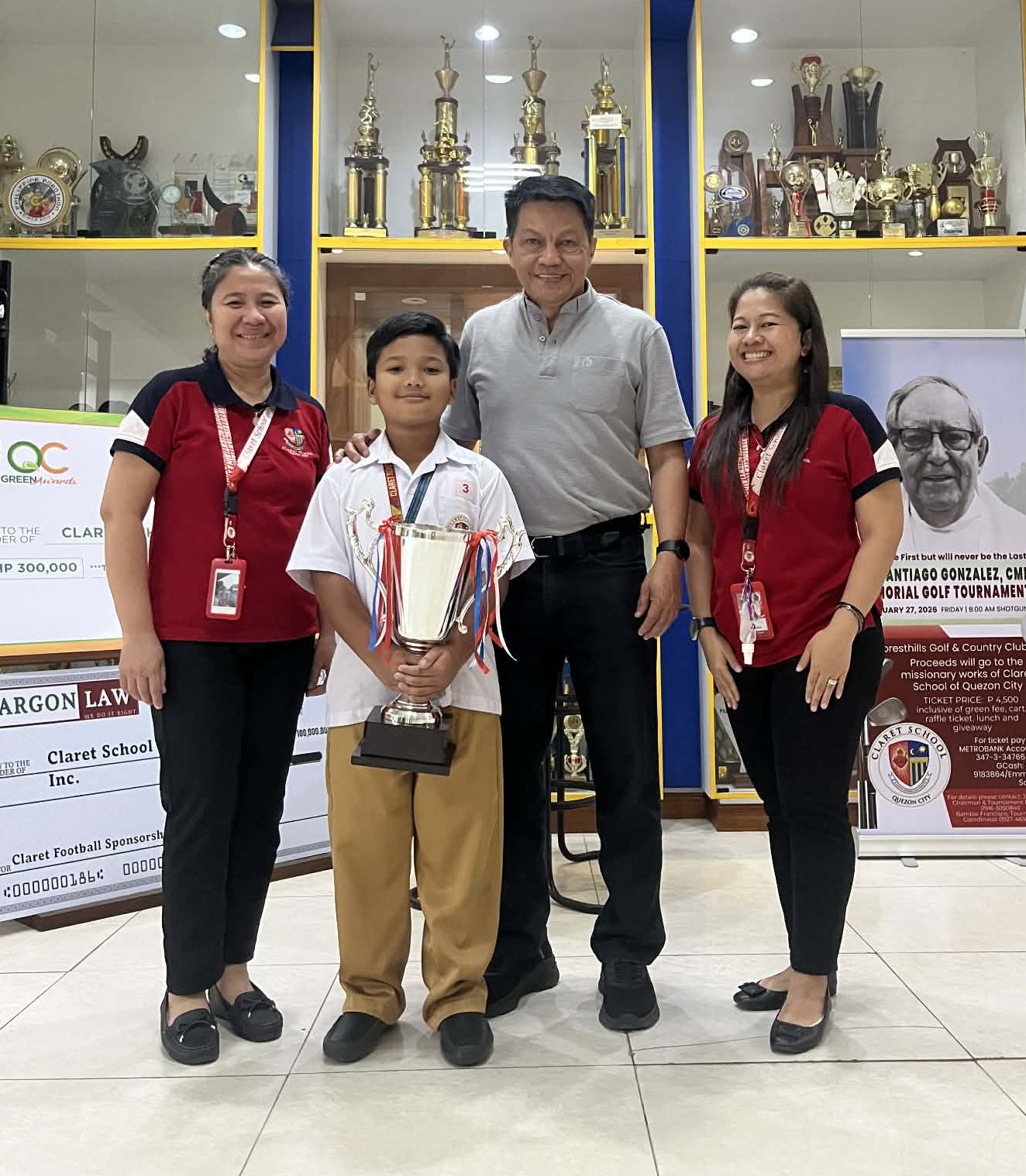 Champion Michael Drake D. Matias with Fr. Victor F. Sadaya, CMF, School Director and Mrs. Grace P. Ticman and Mrs. Lorelie T. Chua-Guevarra